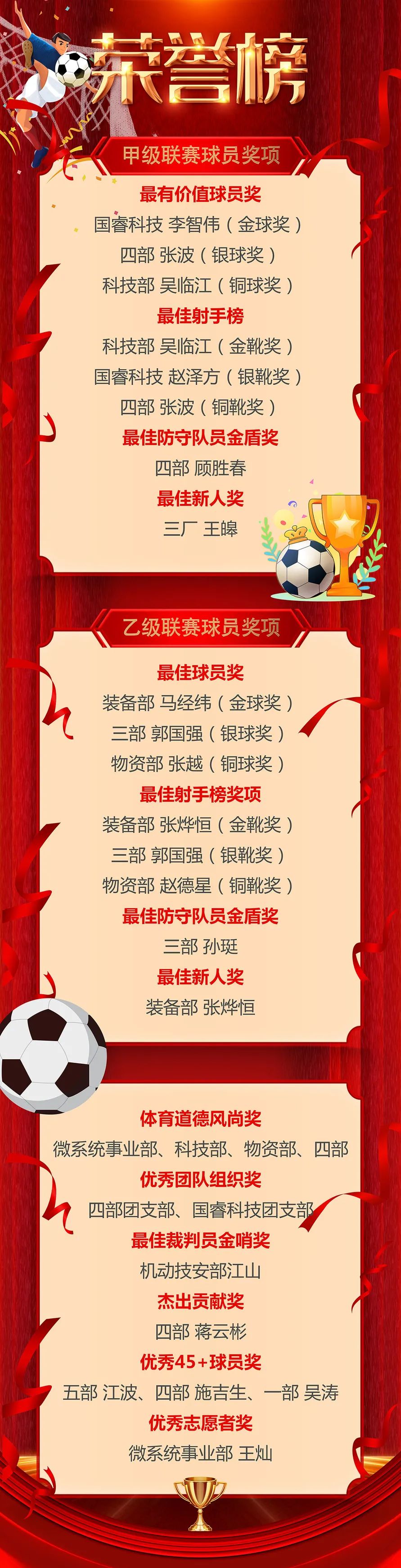 经过8周62场精彩奋战,本届“张直中杯”五人制足球赛于10月19日在鱼嘴湿地公园落下帷幕,国睿科技奋斗者和装备部飓风队以七连胜的绝对优势获得甲、乙级联赛冠军。