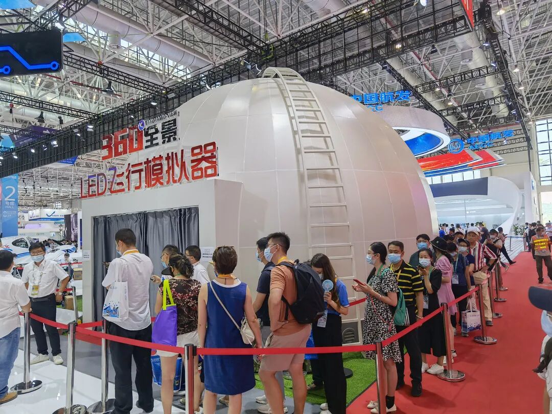 在本次航展的2号馆,在一间穹顶“小灰屋”外等待体验的排队人流从未断过,这就是14所展出的360°全景LED沉浸式飞行模拟器,这款模拟器开创性的将商用LED穹幕技术与飞行模拟训练系统进行跨界融合。除了飞行训练,该产品还可以广泛应用于民生服务行业,如新飞机研究、验证,以及各类科技场馆、飞行体验馆、青少年宫、中小学航空实验室进行航空科普等等。